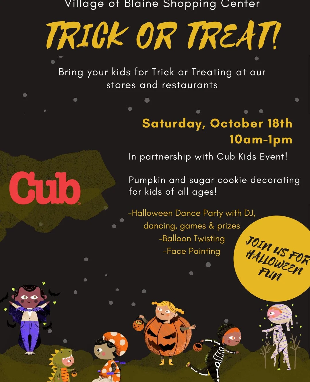 Join us Saturday, October 18th from 10am–1pm at Village of Blaine for a morning of Halloween fun in partnership with Cub Kids Event! Bring your kids for Trick-or-Treating at our stores and restaurants, and enjoy pumpkin and sugar cookie decorating, a Halloween dance party with games and prizes, face painting, balloon twisting, and more — fun for kids of all ages!