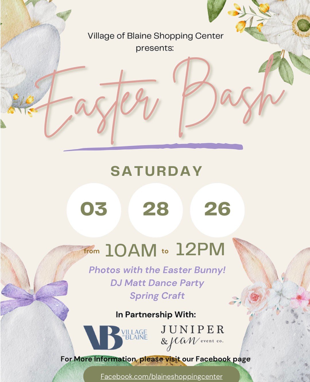 Hop on over to The Village of Blaine for some springtime fun. Join us for our Easter Bash on March 28th from 10AM-12PM. Bring the family for photos with the Easter Bunny, a DJ Matt dance party, a festive spring craft and more. We can't wait to celebrate with you!